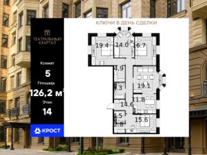 Площадь квартиры составляет 126,2 кв.м и находится на 14-ом этаже 19-этажного здания. Концепция комплекса вдохновлена театральной тематикой, предлагая сочетание неоклассической архитектуры с оригинальной отделкой холлов, изысканными фасадами и созданием культурно-просветительского пространства.