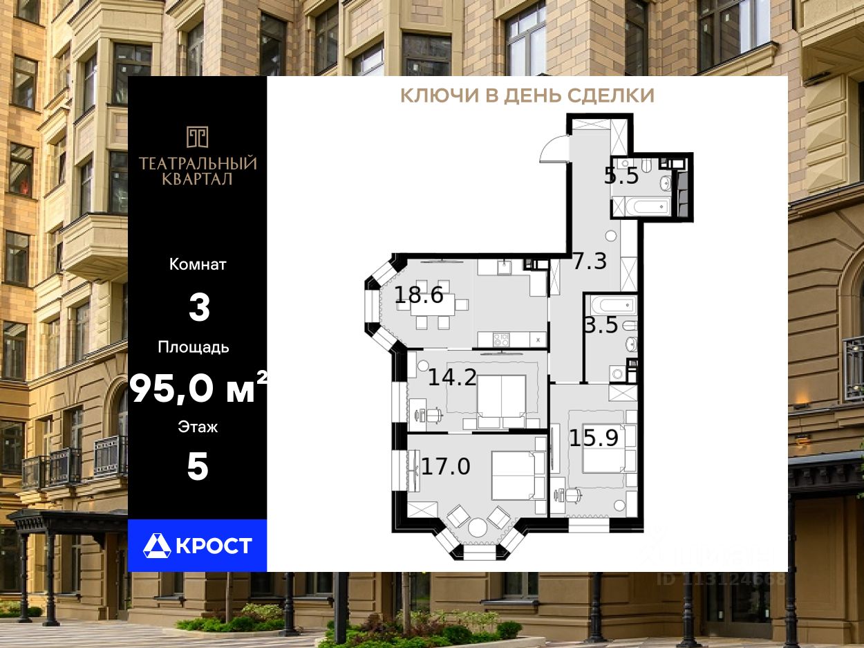 Площадь квартиры составляет 95,00 кв.м и находится на 5-ом этаже 19-этажного здания. Концепция комплекса вдохновлена театральной тематикой, предлагая сочетание неоклассической архитектуры с оригинальной отделкой холлов, изысканными фасадами и созданием культурно-просветительского пространства.