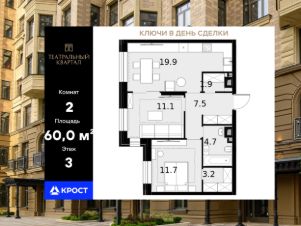 Площадь квартиры составляет 60,00 кв.м и находится на 3-ом этаже 24-этажного здания. Концепция комплекса вдохновлена театральной тематикой, предлагая сочетание неоклассической архитектуры с оригинальной отделкой холлов, изысканными фасадами и созданием культурно-просветительского пространства.