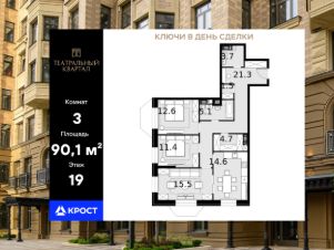 Площадь квартиры составляет 90,10 кв.м и находится на 19-ом этаже 19-этажного здания. Концепция комплекса вдохновлена театральной тематикой, предлагая сочетание неоклассической архитектуры с оригинальной отделкой холлов, изысканными фасадами и созданием культурно-просветительского пространства.