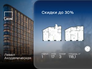 В Академическом районе продаётся 3-комнатная квартира площадью 118.10 кв.м без отделки. Квартира расположена на 17-м этаже 19-этажного жилого комплекса бизнес-класса Левел Академическая (компания Level Group).