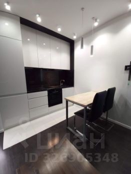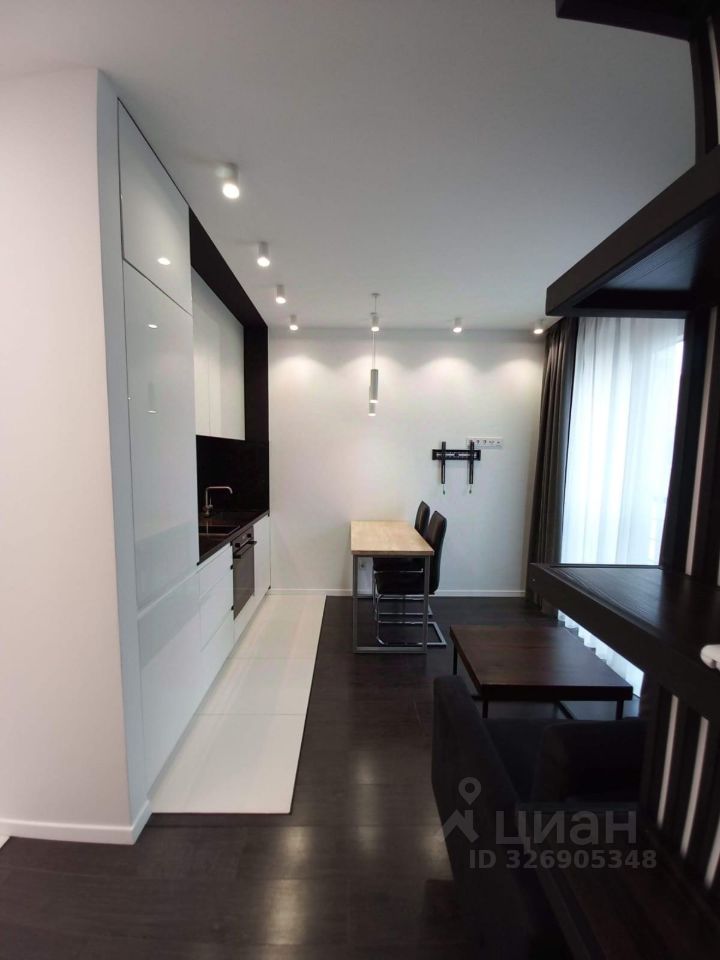 Спальную зону от кухни отделяет барная стойка. Кухня оснащена современной бытовой техникой: варочная панель, духовка, холодильник, посудомоечная машина, микроволновая печь