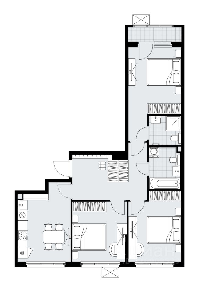 - 2 полноценных санузла (4,4 м² и 3,3 м²): керамогранит, плитка, влагостойкая краска, инсталляция, ванна/душевая
