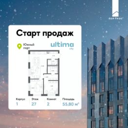 Старт продаж! Продаётся 2-комнатная квартира от застройщика ГК "КОРТРОС" в жилом комплексе бизнес-класса ULTIMAcity. Квартира расположена на 27 этаже 45 этажного корпуса 1. Общая площадь 55,80 м². Без отделки.