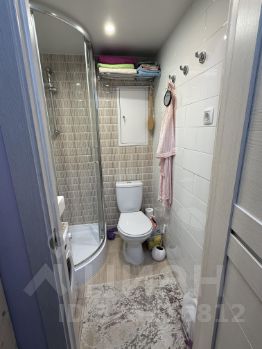 санузел с кабинкой и небольшой стиральной машиной, размещенной под раковиной,