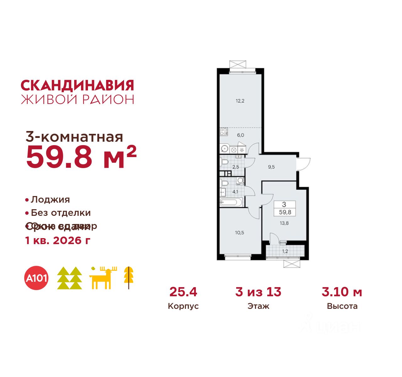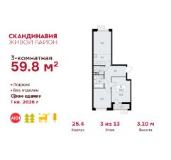 Продается трехкомнатная квартира 630 в новостройке Жилой район "Скандинавия" по адресу Москва, ТиНАО, Новомосковский АО, Сосенское С/П, Коммунарка пос., жилой комплекс Скандинавия, 25.4, район Коммунарка, Новомосковский административный округ, Москва. Общая площадь квартиры - 59.80 кв. м., этаж 3 из 13, секция 7. Тип проекта, по которому построен дом - монолит, компания-застройщик - ООО "А101". Стоимость квартиры - 23239476 Р. Срок сдачи - 2 квартал 2026.
