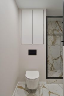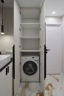 - в санузле предусмотрен хозяйственный шкаф для косметики, бытовой химии и для стиральной машины