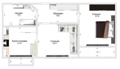 Полностью узаконенная перепланировка: Кухня-столовая- 11 кв.м.; Гостиная- 15 кв.м.; Спальня- 17 кв.м.,