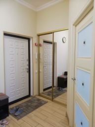 В прихожей установлен большой вместительный шкаф купе с зеркальными дверями, что зрительно увеличивает прихожую и делает ее светлее
