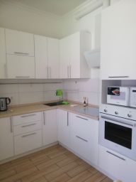 Установлен встроенный кухонный гарнитур белого цвета и столешницей светло-бежевого цвета, с встроенной бытовой техникой