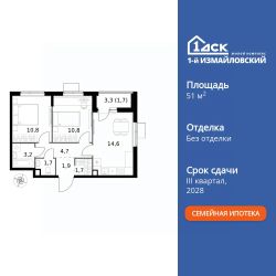 Продаётся 2-к квартира номер 1046 общей площадью 51.1 кв.м. на 17-м этаже 25 этажного здания. Без отделки. Цена с учётом скидки.