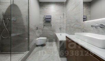 Смесители Groe, зеркало, умывальник с подвесной тумбой, полотенцесушитель Margaroli.