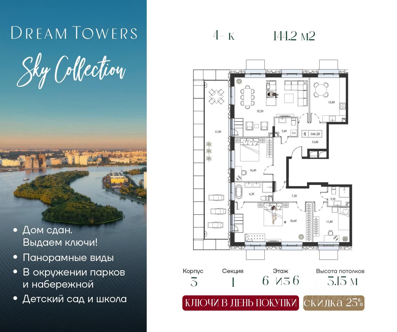 ЖК Dream Towers — проект премиум-класса в окружении парков и набережной, с полностью готовой инфраструктурой для комфортной жизни и отдыха.