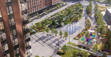 - Центральный парк 8 000 кв. м (прогулочные маршруты, лаундж-зоны; летом — сухой фонтан, зимой — событийная площадь с новогодней елью);
