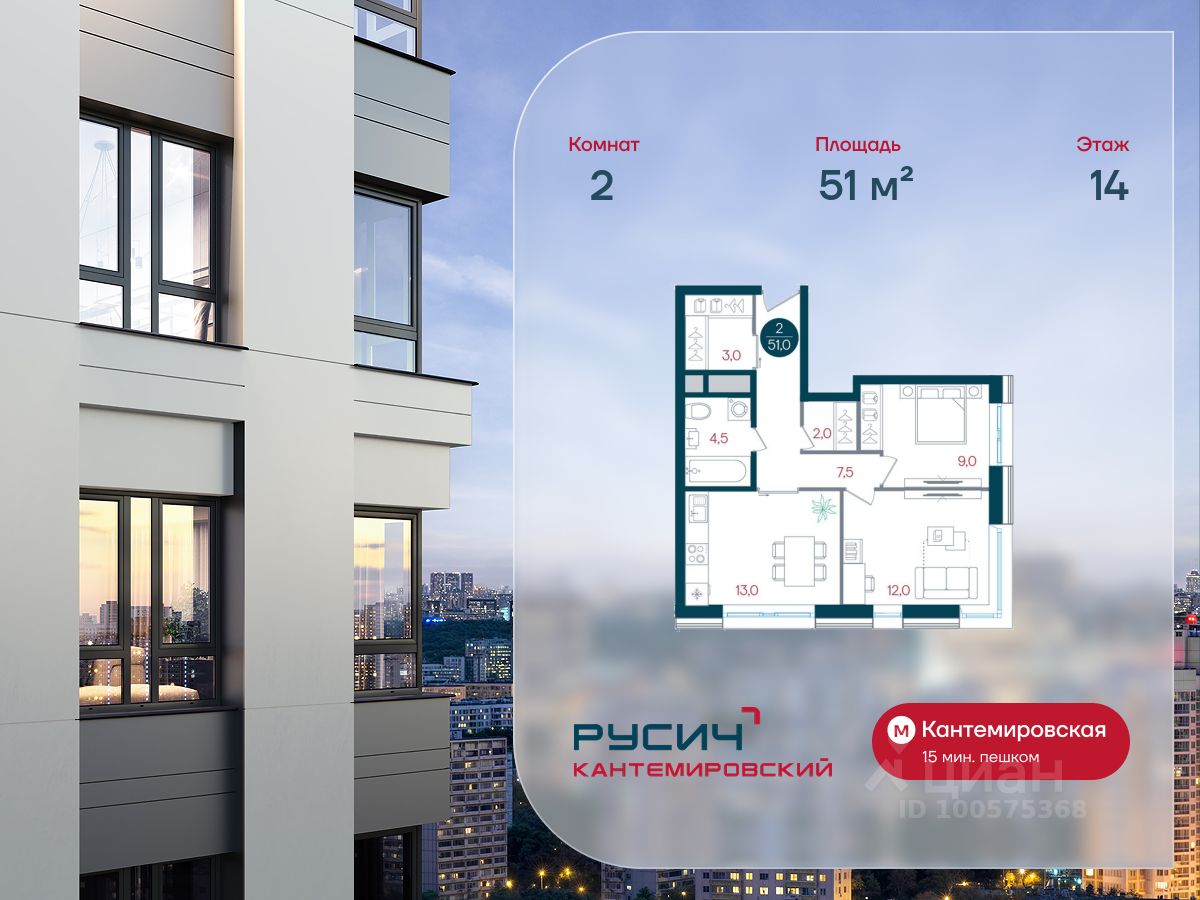 Продается двухкомнатная квартира 126 в новостройке ЖК "Русич Кантемировский" по адресу Москва, ЮАО, Царицыно, Кавказский бульвар, вл. 51/2, корп. 1. Общая площадь квартиры - 51.00 кв. м., этаж 14 из 32, секция 1. Тип проекта, по которому построен дом - монолит, компания-застройщик - Концерн "Русич". Стоимость квартиры - Р. Срок сдачи - 3 квартал 2026. Более подробная информация по телефону.