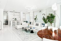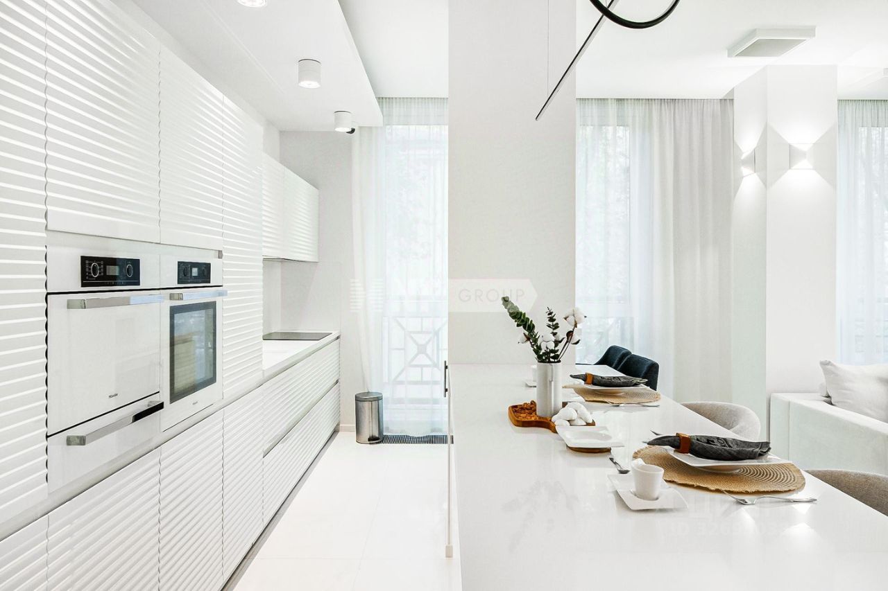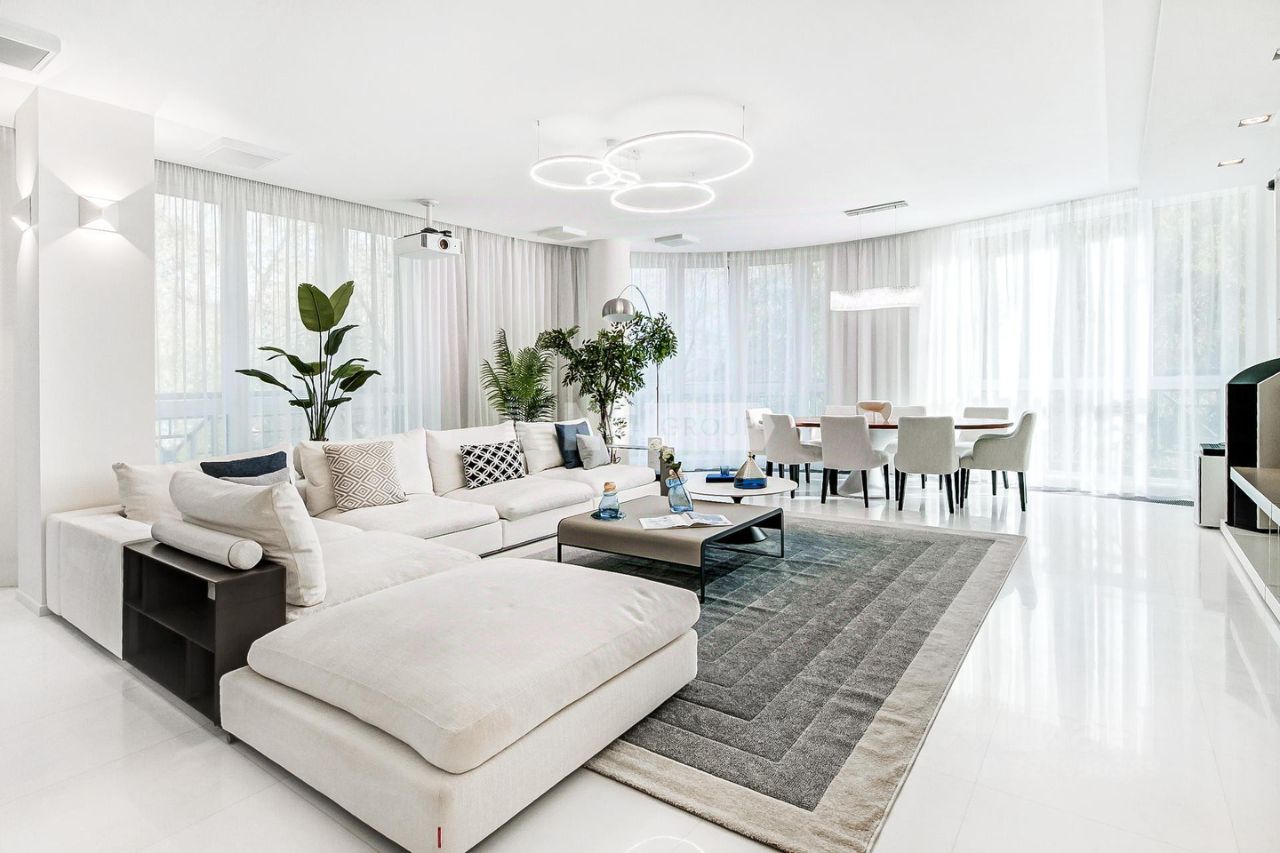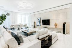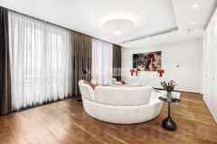 В квартире установлена система кондиционирования Mitsubishi, многоуровневые потолки Lago (Italy), диодные лампы Deltalight c автоматическими сенсорами, полы из дерева Hofparkett, итальянские двери BLUINTERNI.