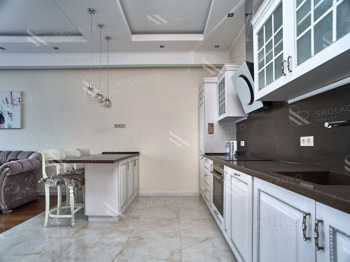На кухне установлена встроенная бытовая техника включая варочную поверхность, духовой шкаф, посудомоечную машину, микроволновую печь, чайник и холодильник.