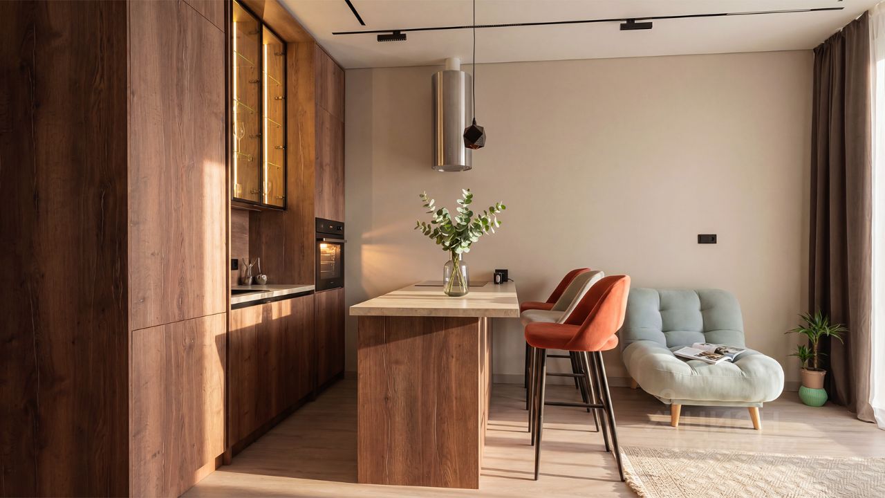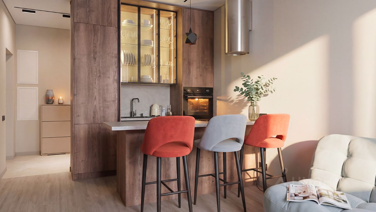 Квартира полностью меблирована и укомплектована бытовой техникой. Функциональная планировка включает кухню-гостиную, спальню, санузел, гардеробную с постирочной зоной и прихожую. Благодаря панорамному остеклению пространство наполнено естественным светом. Из окон открываются виды на город.