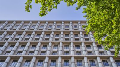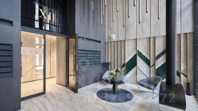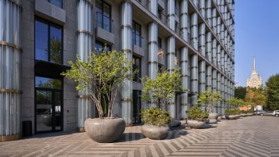 Лобби — решение от архитектурного бюро T+T Architects. Девятиметровые потолки с двойным светом, оформление в стиле тайги, берёзового и бамбукового леса. За зеркальной стойкой ресепшен вас ожидает консьерж, который поможет решить все бытовые вопросы. На внутренней территории дома небольшой сквер и детская площадка. Плитка выложена геометрическими узорами из гранита контрастных цветов. Для машин предусмотрели подземный паркинг на 125 мест с садом четырёх сезонов на крыше. На протяжении всего теплого времени года сад благоухает цветами — от ранневесеннего крокуса до осенней астры.