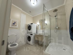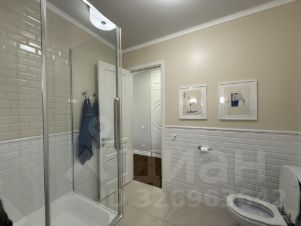 Санузел совмещённый: душ с тропическим лейком, пенал, тумба с раковиной, стеклянная перегородка.