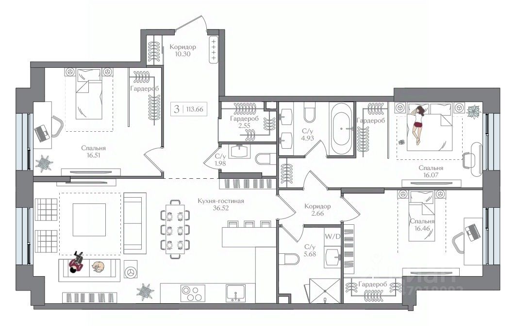 Продаётся 3-комнатная квартира в строящемся доме (Корпус 5 (II очередь)), срок сдачи: II-кв. 2027, общей площадью 113.66 кв.м., на 9 этаже. Жилой комплекс с подземной автостоянкой, отдельно стоящими ДОУ, БНК (учебный корпус) и многофункциональным центром.