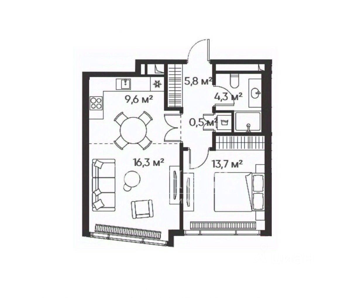 • Планировочное решение: возможна организация 1 спальни, просторной кухни-гостиной, совмещённого санузла, гардеробной комнаты и холла-прихожей