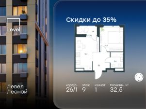 В районе, утопающем в густой зелени лесов, многочисленных парков и скверов, продаётся 1-комнатная квартира площадью 32.50 кв.м с отделкой white box. Квартира расположена на 9 этаже в жилом комплексе комфорт-класса Левел Лесной (компания Level Group/Левел групп).