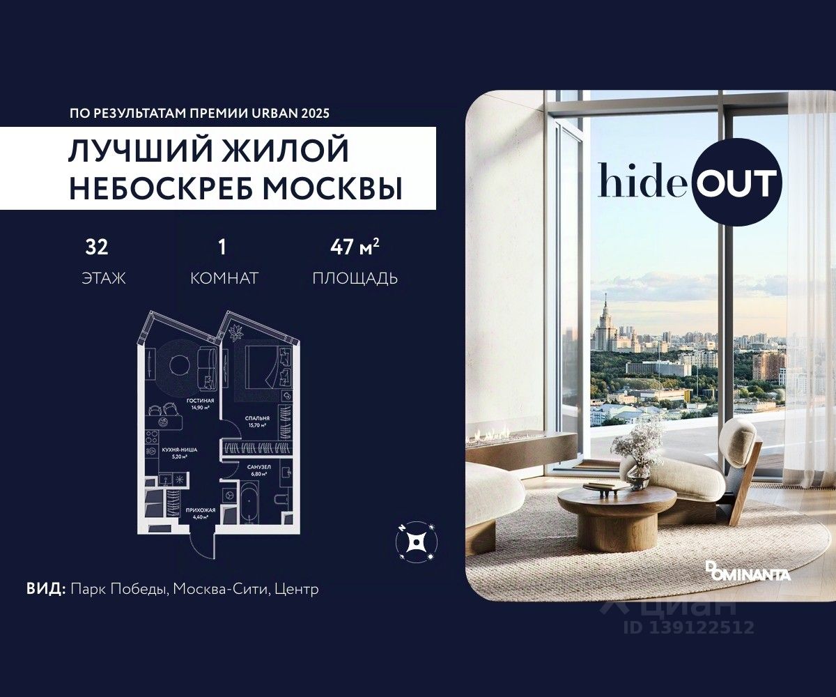 Прямая продажа от застройщика. Продается 2-комнатная квартира площадью 47 кв.м. на 3-м этаже 34-этажного дома в ЖК hideOUT с панорамными видами: Центр. Высота потолков 3,25 м. hideOUT — премиальный проект компании Dominanta. Это новый уровень жизни и комфорта без компромиссов. Две башни — 34 и 49 этажей — открывают захватывающие виды на Москву. Архитектурной доминантой проекта становится мост, соединяющий башни на высоте 80 метров. Закрытая территория, охрана 24/7, зона экстренной безопасности на подземном уровне, система пожаротушения. На мосту между башнями на 22-м этаже находится SocialHUB — предусмотрено 16 комфортных пространств для работы, отдыха и развлечений с панорамными видами и клубным форматом доступа. Концепция благоустройства hideOUT — баланс между природой и технологичным городом будущего. На территории сада предусмотрены 15 зон для отдыха, работы, спорта и детей. Знаковым местом станет центральная площадь с амфитеатром и водопадом — сочетание камней, растений и струящейся воды создает идеальный баланс с природой. В проекте действуют привлекательные условия покупки: - скидка до 20% при 100% оплате стоимости лота и ипотеке без субсидирования. Предложение действует до 28.02.2026. - рассрочка 0% на 12 месяцев с первоначальным взносом 30% / на 18 месяцев с первоначальным взносом 50%. Застройщик АО "СЗ "ХАЙДАУТ", ИНН 7729058636, ОГРН 1027739319420. Проектная декларация на сайте наш.дом.рф. Предложение не является публичной офертой.