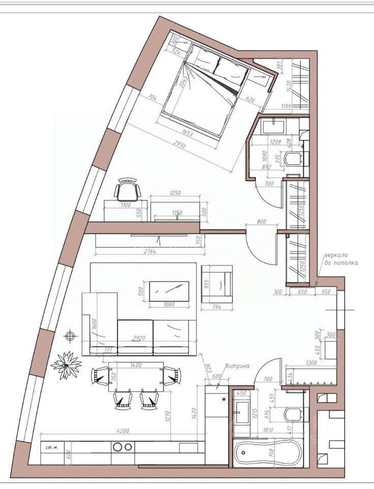 КВАРТИРА: Планировка представляет собой большую просторную кухню-гостиную, изолированную спальню, гардеробную и два сан узла.