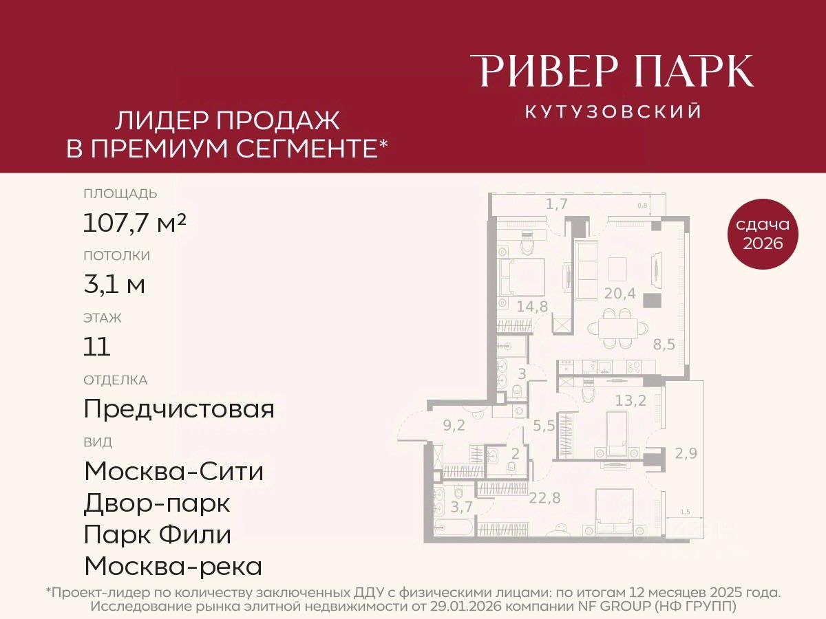 Продается 3-к квартира площадью 107.7 кв.м. на 11-м этаже в жилом комплексе премиум-класса Ривер Парк Кутузовский в Башне Изумруд
