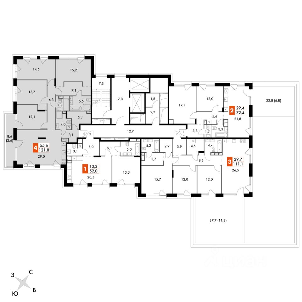 Продаётся 5-к квартира номер 76 общей площадью 122.3 кв.м. на 13-м этаже 16 этажного здания. Без отделки. Цена с учётом скидки.