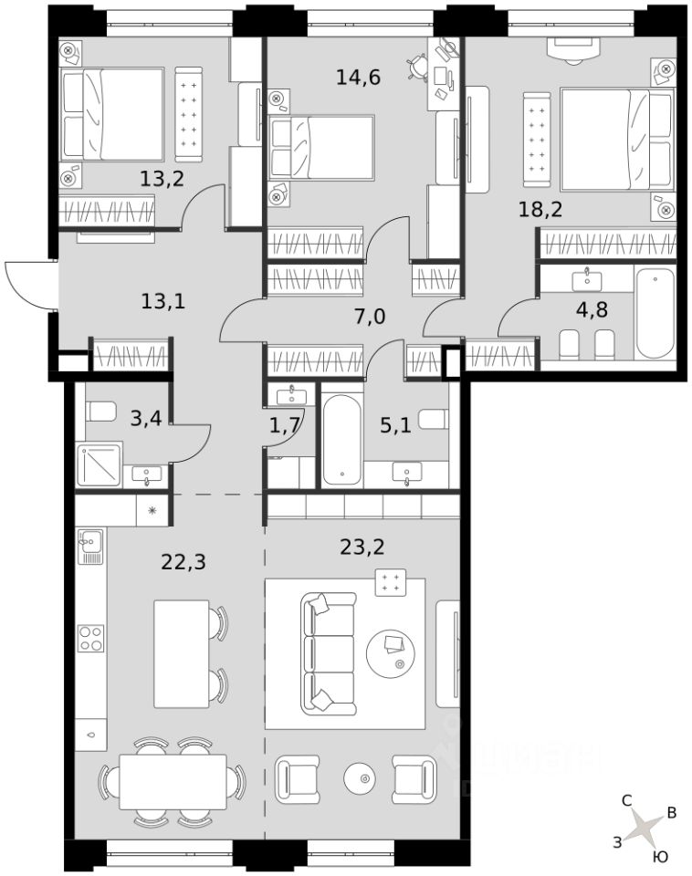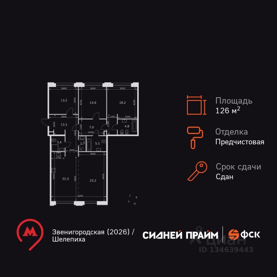 Продаётся 3-к квартира номер 31 общей площадью 126.6 кв.м. на 4-м этаже 8 этажного здания. Предчистовая отделка. Цена с учётом скидки.