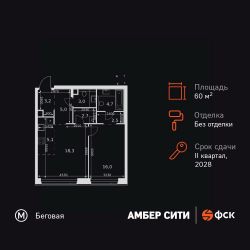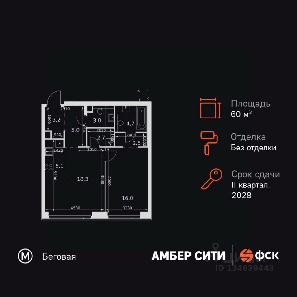 Продаётся 2-к квартира номер 1235 общей площадью 60.5 кв.м. на 48-м этаже 57 этажного здания. Без отделки. Цена с учётом скидки.