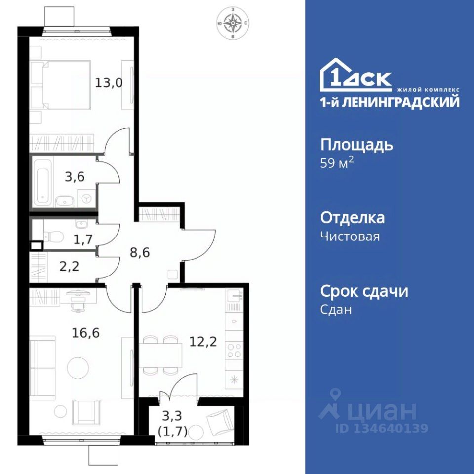 Продаётся 2-к квартира номер 181 общей площадью 59.4 кв.м. на 5-м этаже 15 этажного здания. Чистовая отделка. Цена с учётом скидки.