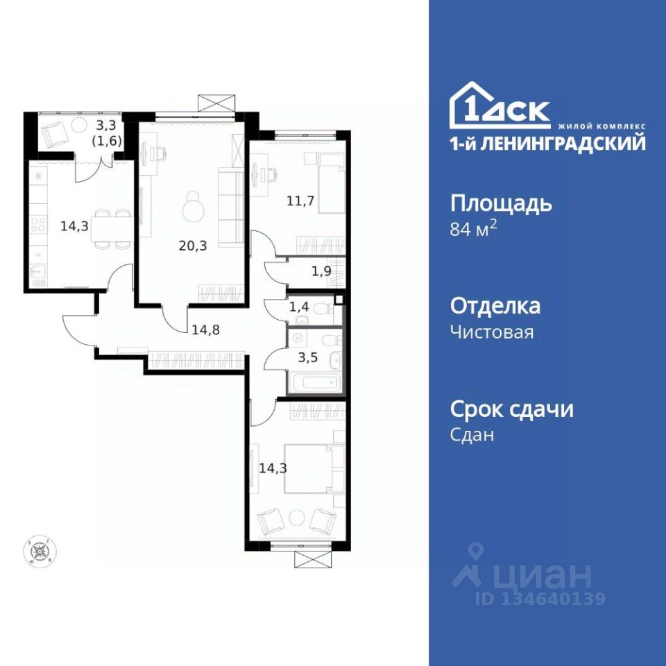 Продаётся 3-к квартира номер 601 общей площадью 84 кв.м. на 9-м этаже 14 этажного здания. Чистовая отделка. Цена с учётом скидки.
