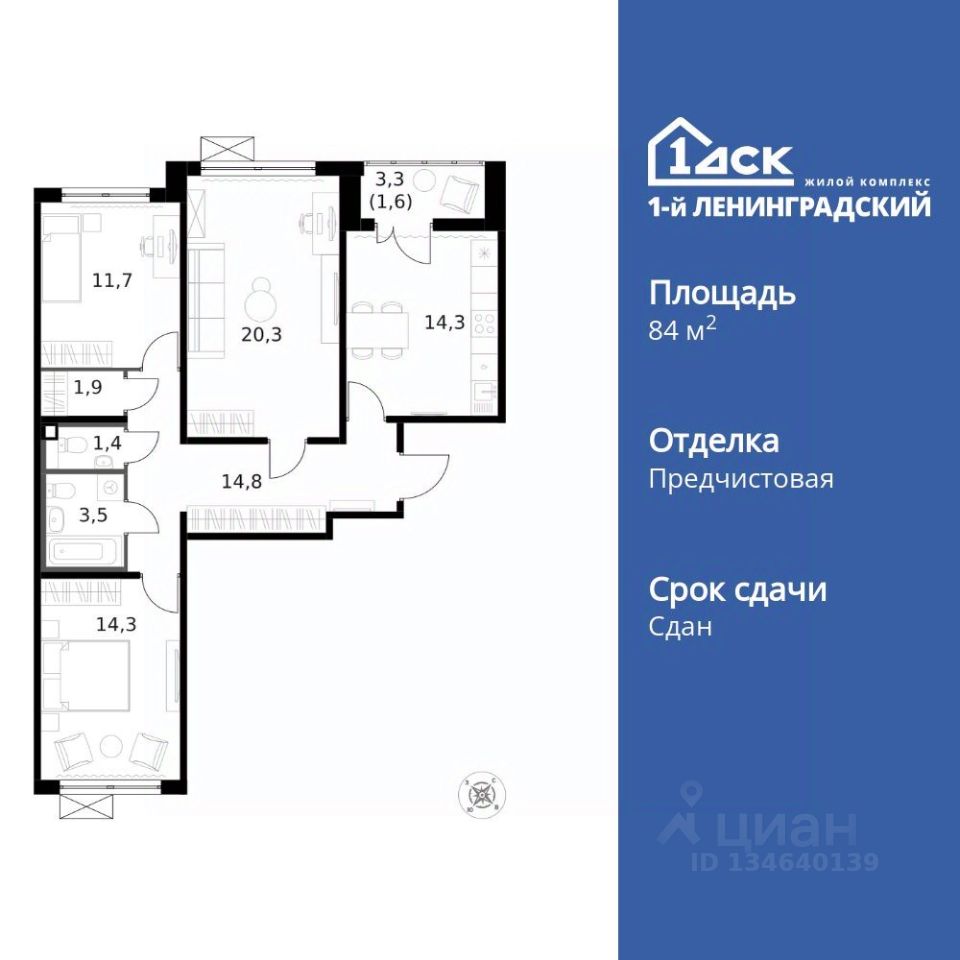 Продаётся 3-к квартира номер 144 общей площадью 84.1 кв.м. на 11-м этаже 14 этажного здания. Предчистовая отделка. Цена с учётом скидки.