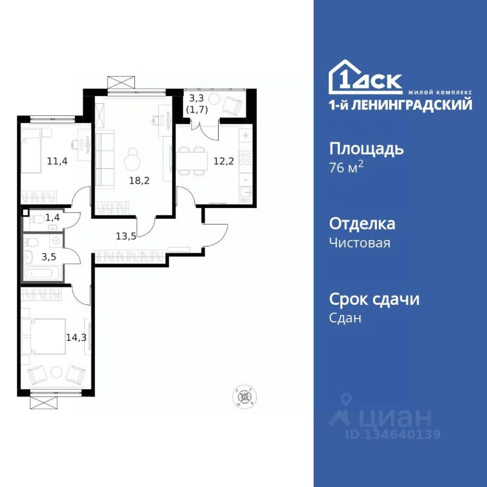 Продаётся 3-к квартира номер 184 общей площадью 76.4 кв.м. на 8-м этаже 14 этажного здания. Чистовая отделка. Цена с учётом скидки.