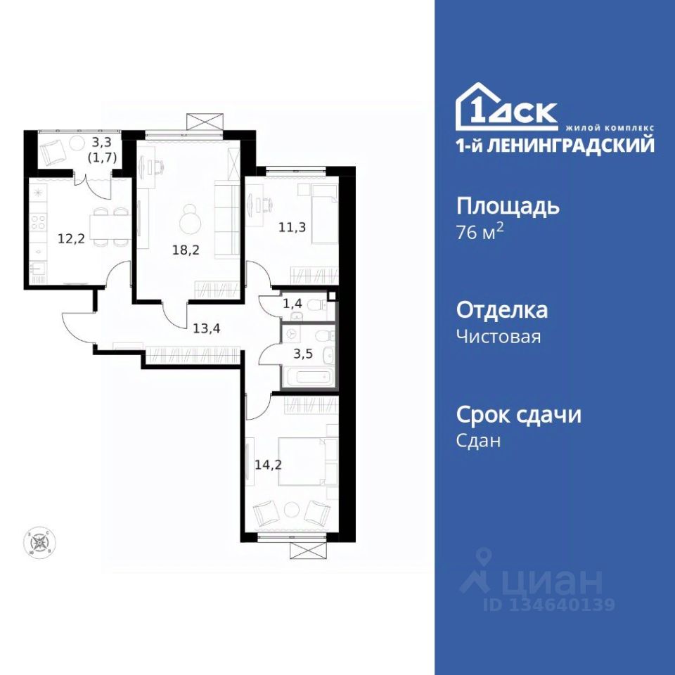 Продаётся 3-к квартира номер 201 общей площадью 76.1 кв.м. на 13-м этаже 14 этажного здания. Чистовая отделка. Цена с учётом скидки.