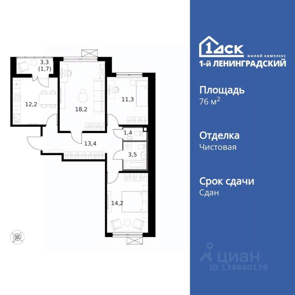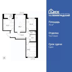 Продаётся 3-к квартира номер 205 общей площадью 76.1 кв.м. на 14-м этаже 14 этажного здания. Чистовая отделка. Цена с учётом скидки.