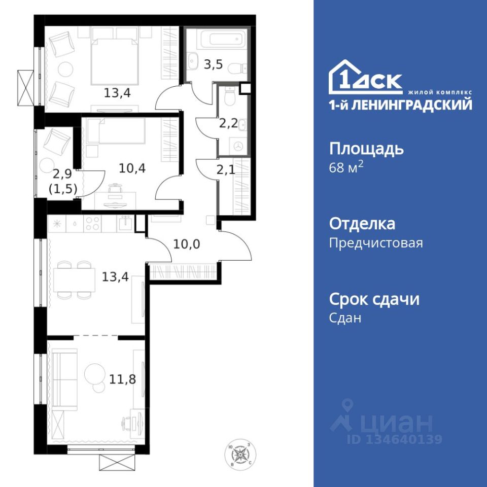 Продаётся 3-к квартира номер 362 общей площадью 68.4 кв.м. на 5-м этаже 14 этажного здания. Отделка Whitebox. Цена с учётом скидки.