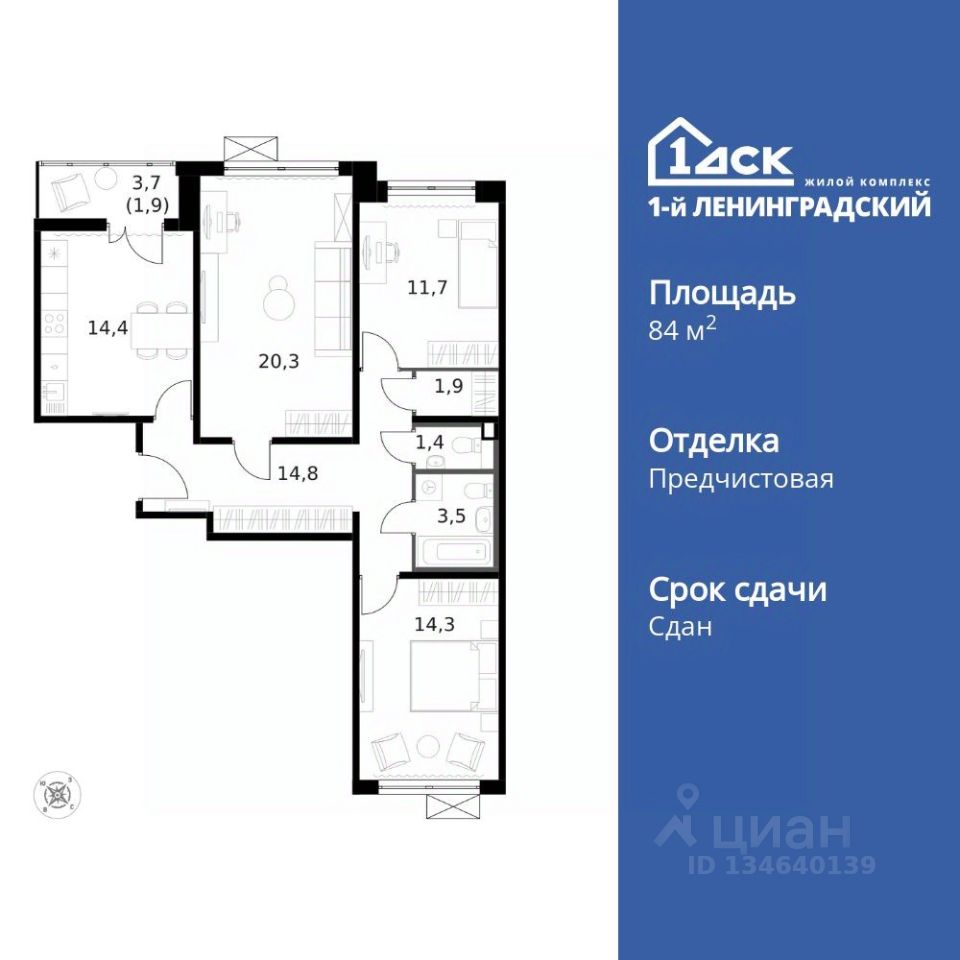 Продаётся 3-к квартира номер 400 общей площадью 84.4 кв.м. на 12-м этаже 14 этажного здания. Отделка Whitebox. Цена с учётом скидки.