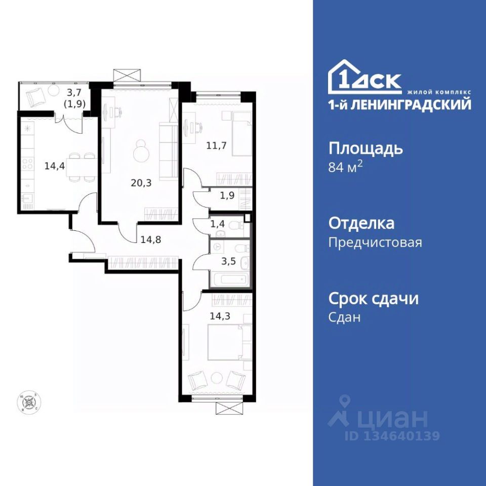 Продаётся 3-к квартира номер 412 общей площадью 84.4 кв.м. на 14-м этаже 14 этажного здания. Предчистовая отделка. Цена с учётом скидки.