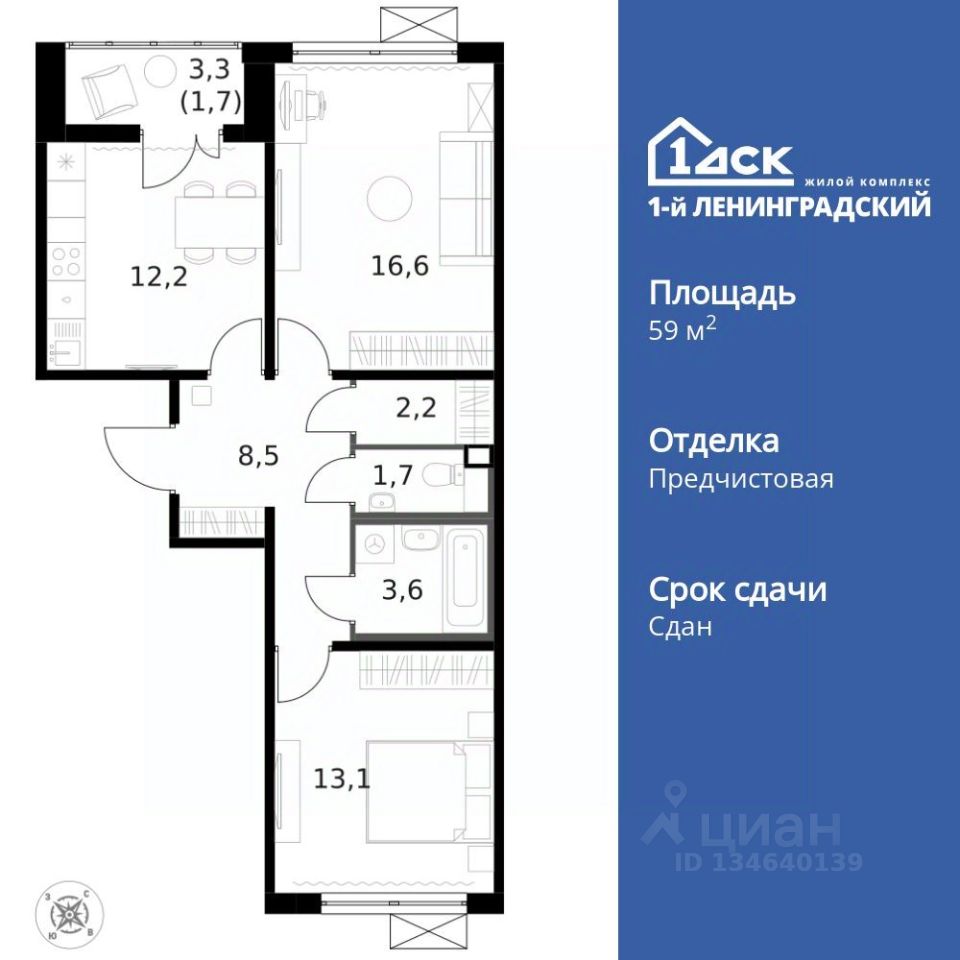 Продаётся 2-к квартира номер 493 общей площадью 59.6 кв.м. на 8-м этаже 14 этажного здания. Предчистовая отделка. Цена с учётом скидки.