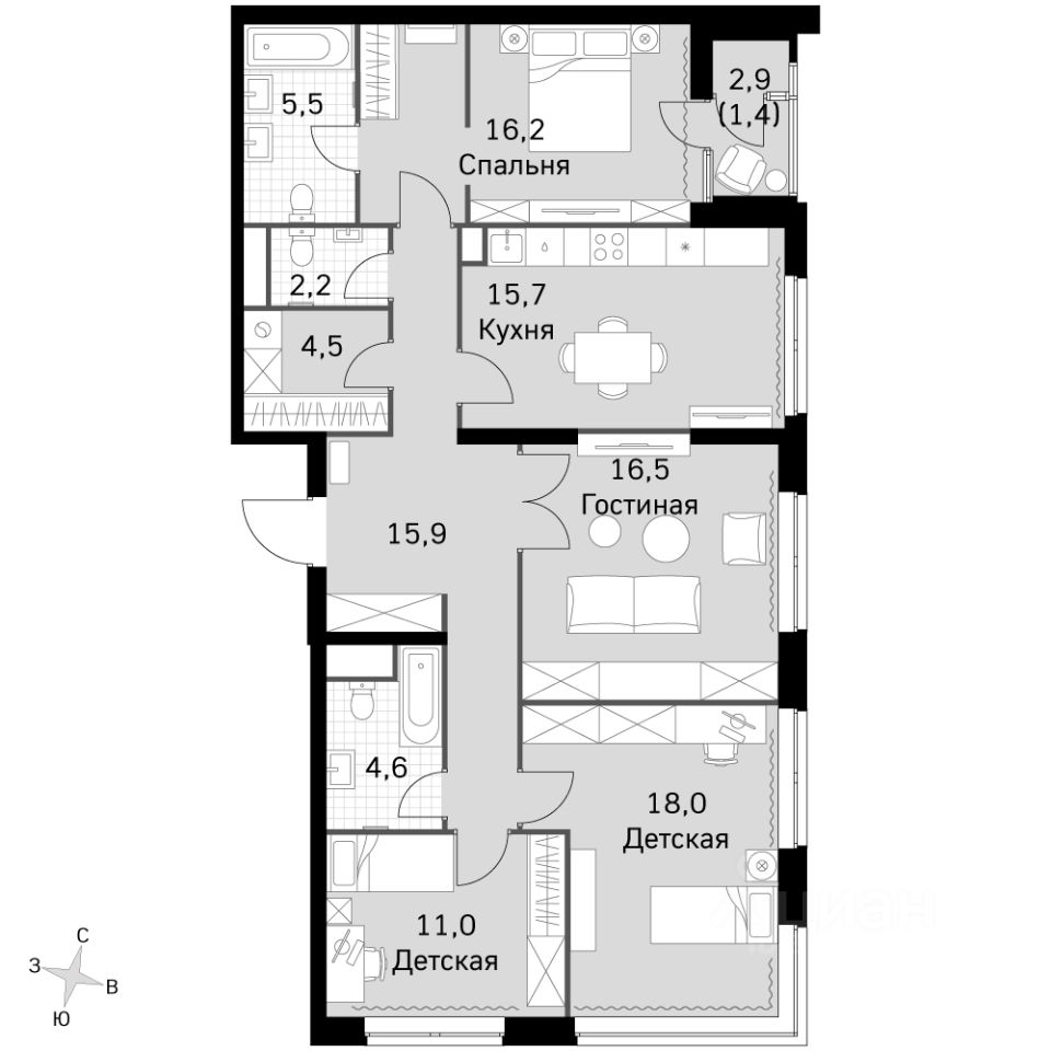 - Мастер-зона с санузлом и гардеробной. Всё для вашего комфорта и удобства, включая личный санузел и гардероб.