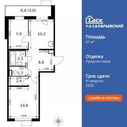 Продаётся 2-к квартира номер 325 общей площадью 51.5 кв.м. на 12-м этаже 14 этажного здания. Предчистовая отделка. Цена с учётом скидки.