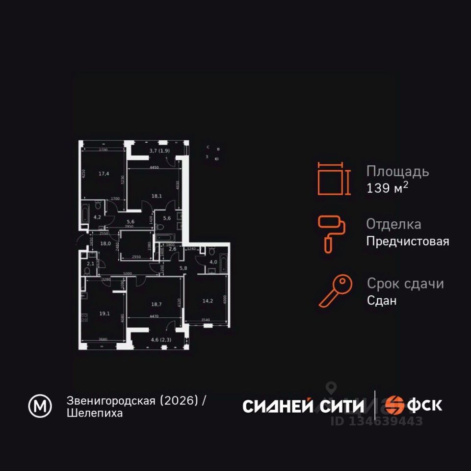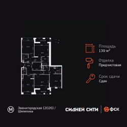 Продаётся 4-к квартира номер 238 общей площадью 139.2 кв.м. на 19-м этаже 20 этажного здания. Предчистовая отделка. Цена с учётом скидки.