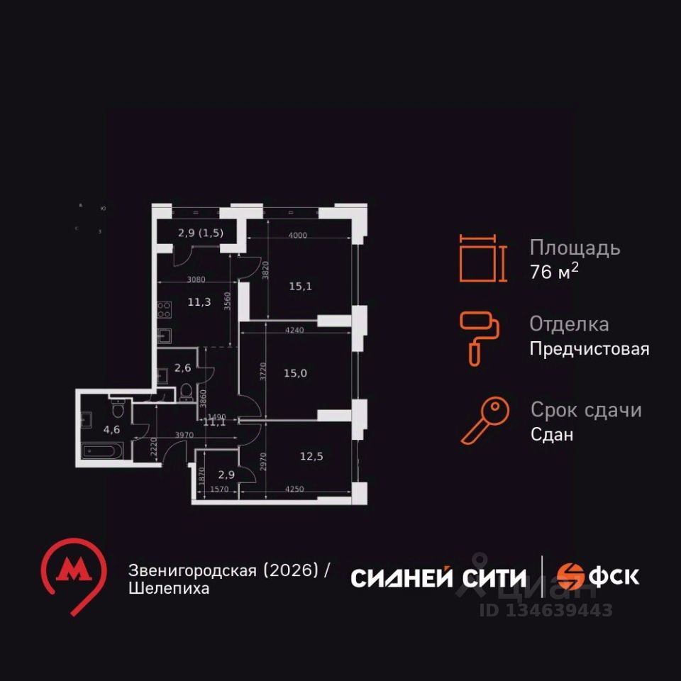 Продаётся 3-к квартира номер 6 общей площадью 76.6 кв.м. на 2-м этаже 43 этажного здания. Предчистовая отделка. Цена с учётом скидки.