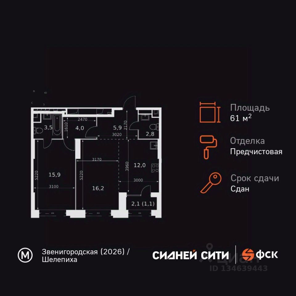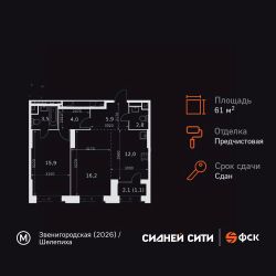 Продаётся 2-к квартира номер 25 общей площадью 61.4 кв.м. на 4-м этаже 43 этажного здания. Предчистовая отделка. Цена с учётом скидки.