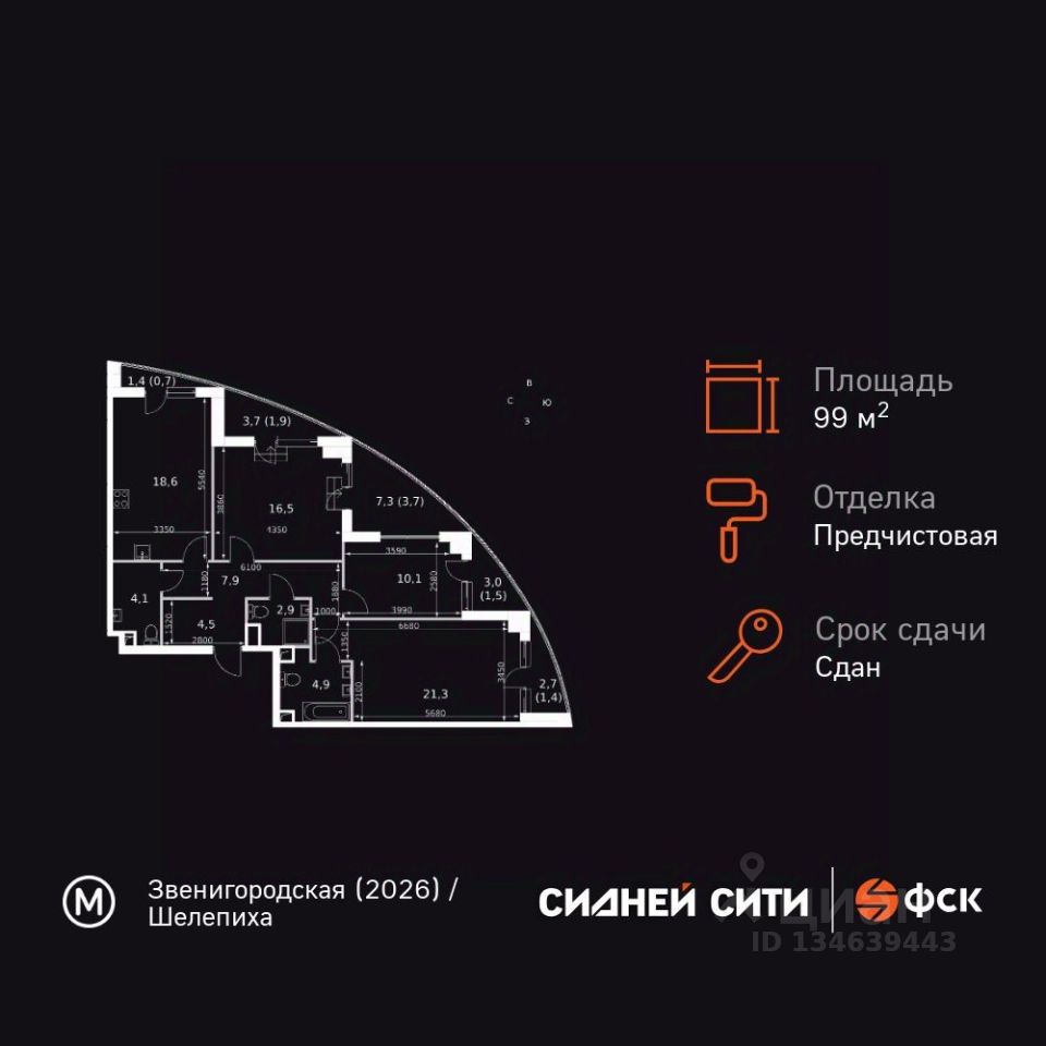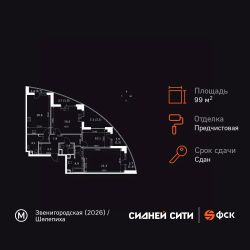 Продаётся 3-к квартира номер 355 общей площадью 99.5 кв.м. на 14-м этаже 44 этажного здания. Предчистовая отделка. Цена с учётом скидки.