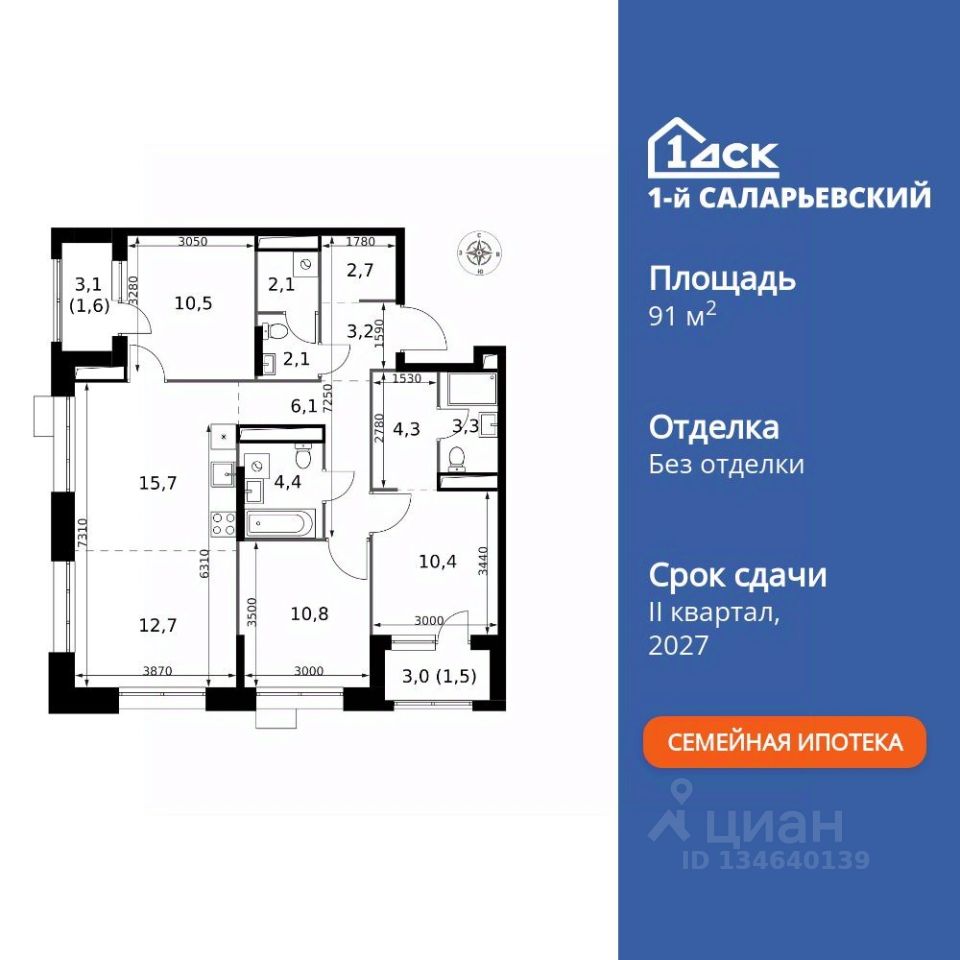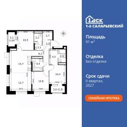 Продаётся 4-к квартира номер 308 общей площадью 91.4 кв.м. на 14-м этаже 25 этажного здания. Без отделки.